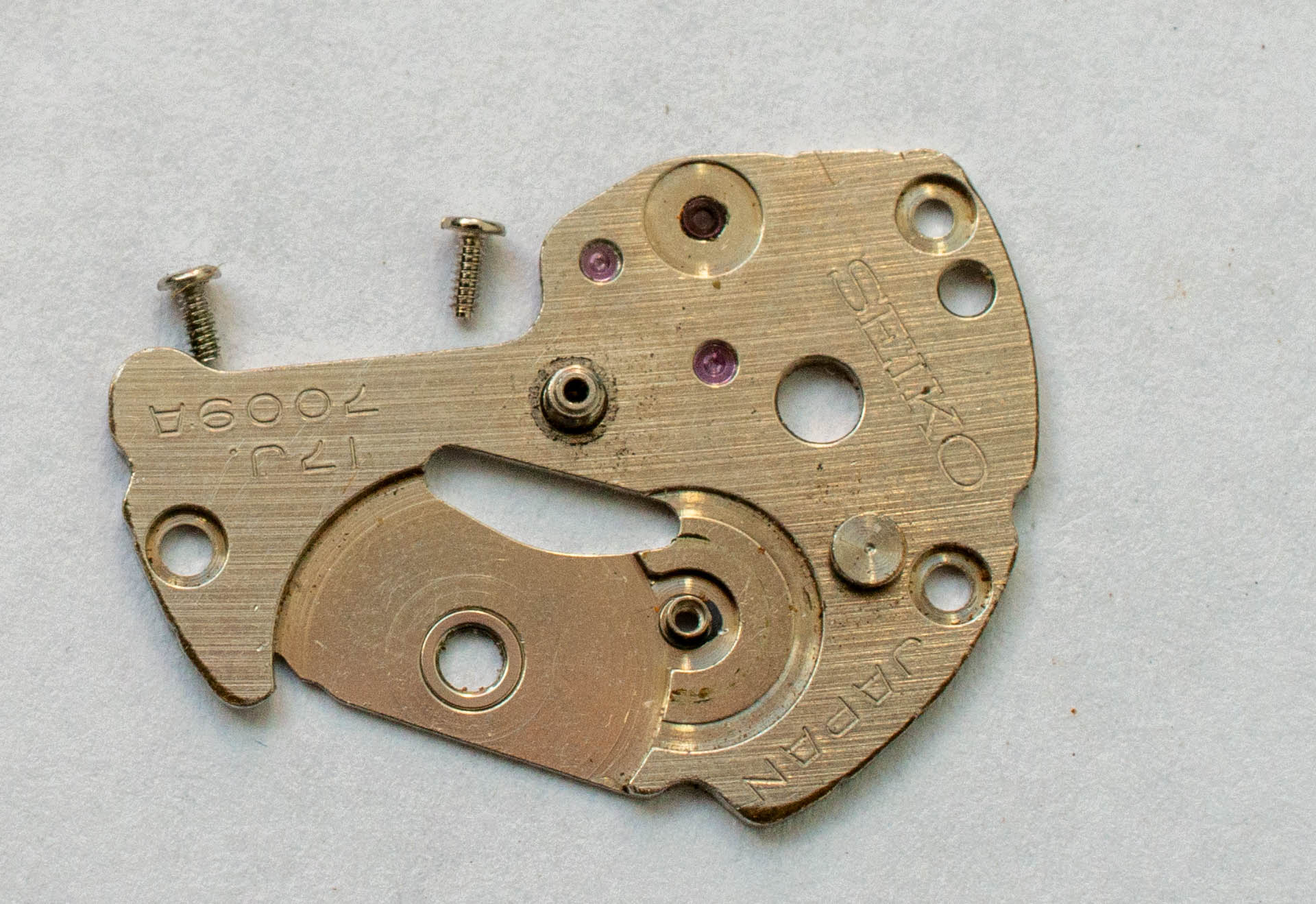 Seiko 7009A 0106 Barrel and train wheel bridgewith 2 screws.